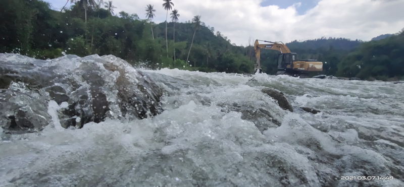 文字说明;该照片是在伯恩河中用手机拍摄,是印尼疫情复工后开辟新施工门路时的场景。在奔腾的洪流中急流拍石,浪花飞溅,挖机迎难而上,象征着公司坚韧不平的品格、水建人大无畏的事情热情。对岸的满山绿树在蓝天白云下,勾勒出一幅壮丽的画面,预示着伯恩电站的美好未来,高高的椰子树,象征着集团公司辉煌的明天!